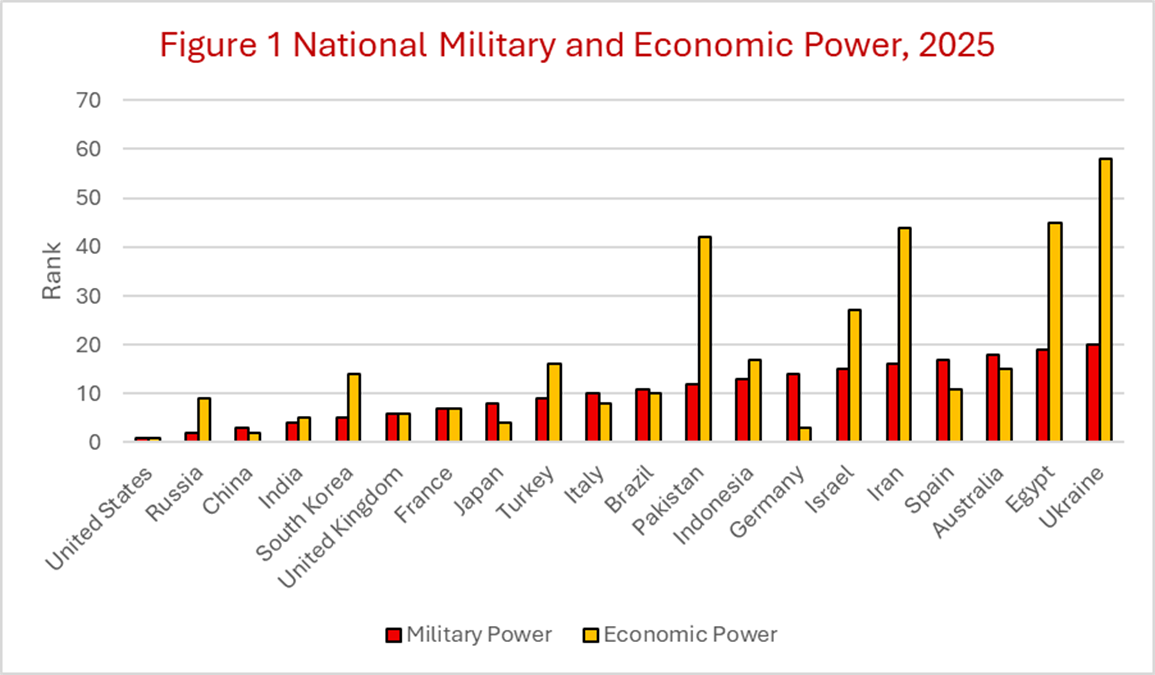 The United States is the most powerful nation in the world. Figure 1 ranks the twenty most powerful military forces on earth based on data from Global Fire Power, a widely respected military-tracking website. The United States ranks number one. Figure 1 also ranks these countries in terms of their economic power measured by the size of their gross domestic product. The United States is again number one.