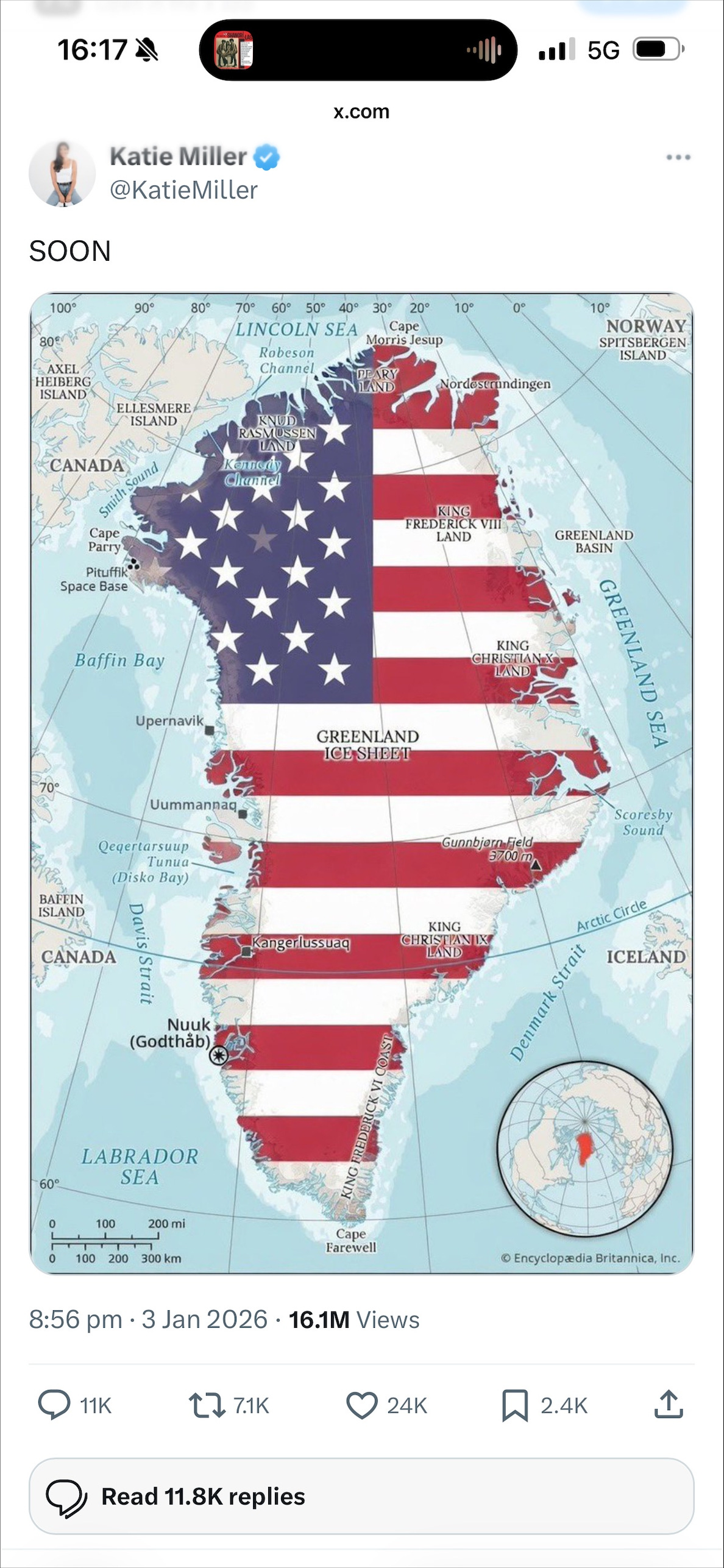 Shortly after the Venezuelan invasion, the wife of Trump’s Homeland Security Advisor posted on X, the social media website, a map of Greenland covered by an American flag. The caption read “SOON.” Neither the Danes nor the Greenlanders were amused. Reuters reported that an overwhelming majority (85%) of Greenlanders say they do not want to become part of the United States and nearly half (45%) view Trump’s interest in Greenland as a serious threat.