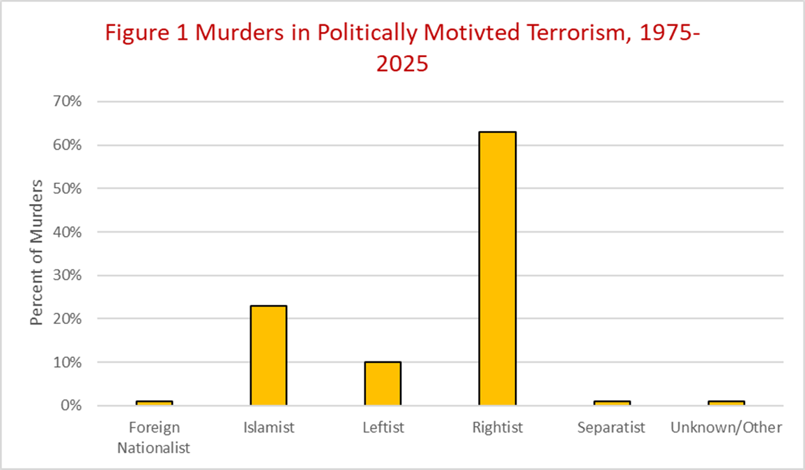 It’s just not true that the left is more prone to violence than the right. Figure 1 presents data from the Cato Institute, a well-known libertarian think tank. Not including deaths from the 9/11 attacks by Islamic terrorists, it breaks down the 620 politically motivated terrorist murders committed in the United States from January 1, 1975, through September 10, 2025 by the perpetrator’s ideology. It turns out, contrary to the claims of Trump, Ingraham and their compatriots, that 63% of these murders were committed by right-wing terrorists while only 10% were committed by left-wing terrorists. In other words, the right was six times more likely to kill for political reasons than the left!