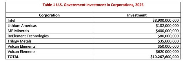 When it comes to capitalism despite Republicans’ alleged aversion to government involvement in the economy, they have supported spending billions of taxpayer dollars to buy minority ownership in several big corporations. Government ownership of the means of economic production is quintessential socialism. Table 1, based on data from The New York Times, shows that Uncle Sam invested nearly $10.3 billion in corporations during Trump’s second term.